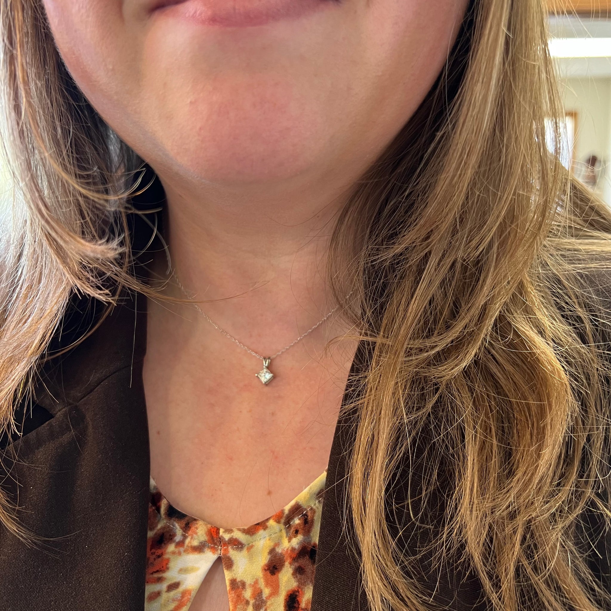 14k white gold pendant with 3/4ct (5mm square) princess cut moissanite gemstone pendant on 16” chain.