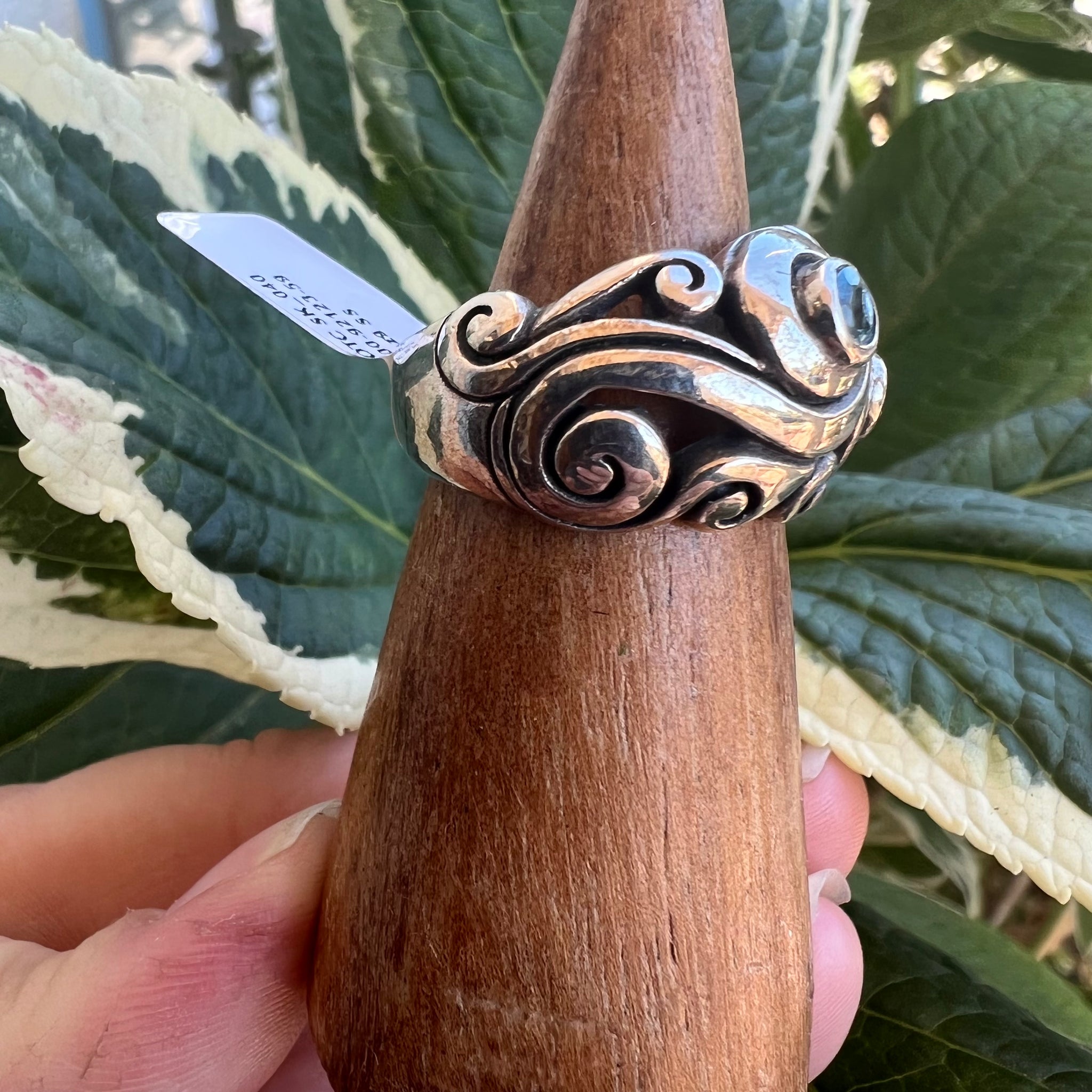 Sterling silver scroll design band with 2 blue topaz As I said gemstones, ring size 9